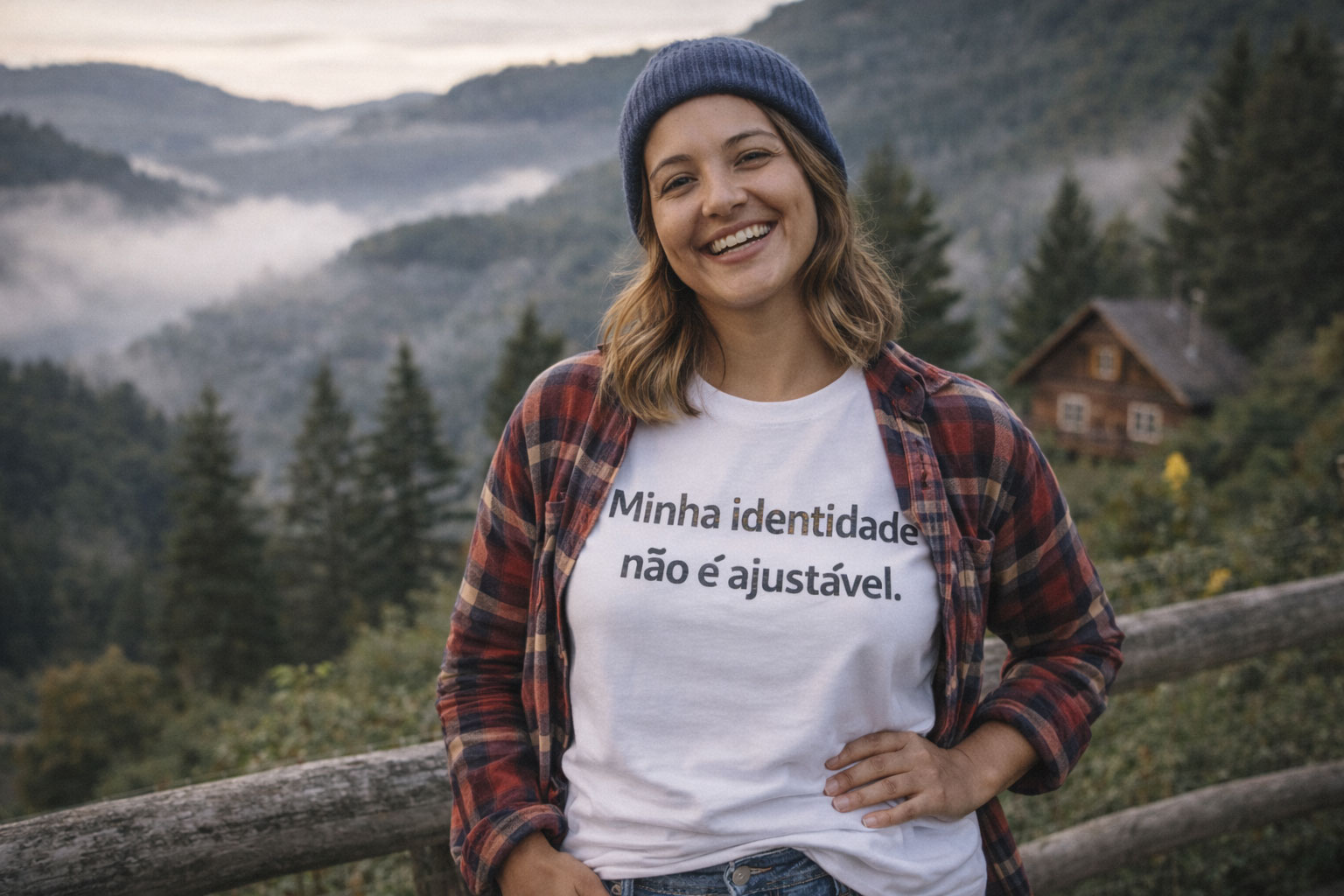 A frase presente na camiseta funciona como um reforço visual da identidade, aumentando a coerência entre aparência e percepção interna.