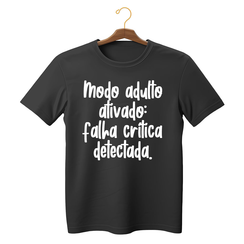 Seja para um encontro descontraído, um passeio ou até no trabalho em ambientes informais, a camiseta “Modo adulto ativado, falta crítica detectada” garante risadas e conversas, além de destacar a personalidade de quem a veste. É moda com humor, consciência e autenticidade.